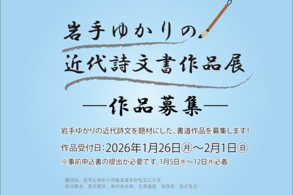 - 今回で4回目の開催です。岩手にゆかりのある近代詩文を題材にした書道作品を募集します。たくさんのご応募お待ちしております。 【募集内容】 応募資格:岩手県在住の方(18歳以上) ...